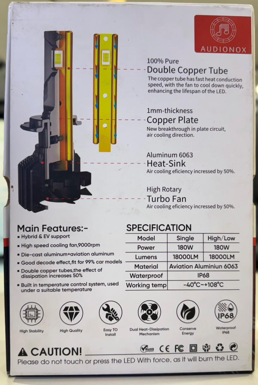 The Audionox H7 180W LED Headlight is a high-performance lighting solution built for vehicles that use H7 bulb sockets. It operates on a voltage range of approximately 9–36V DC, making it compatible with most 12V and 24V systems. Each bulb delivers a powerful 180 watts of output, producing an intense cool white light with a color temperature around 6000K, which provides a clear, daylight-like illumination for improved visibility at night. The headlight typically offers a luminous flux between 10,000 and 20,000 lumens per pair, ensuring strong, wide, and uniform light coverage on the road.
