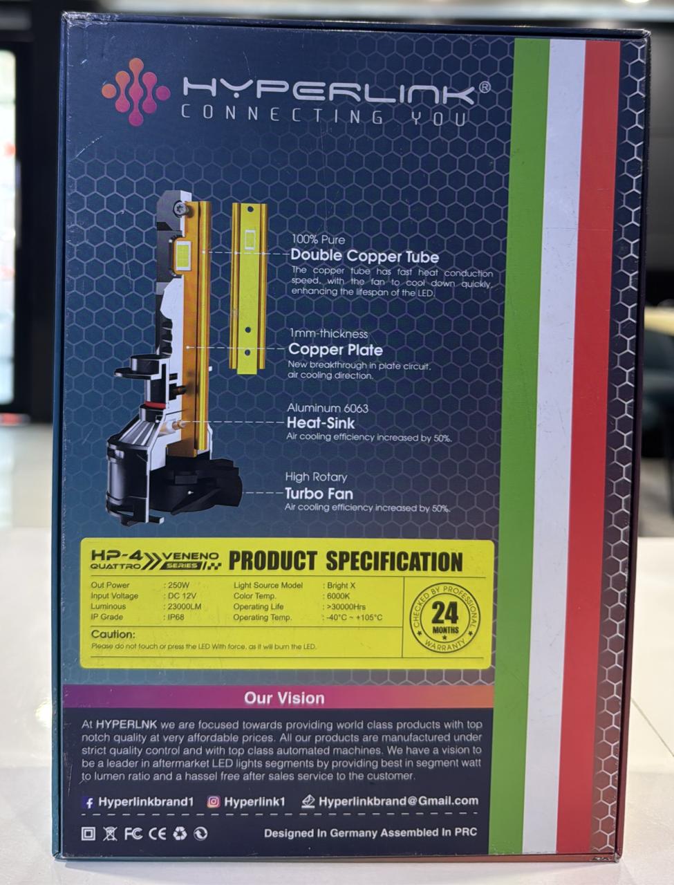 Upgrade your driving visibility with the Hyperlink 250W LED HeadLight HP-4 QUATTRO. Designed for superior brightness, this headlight offers a perfect balance of power and efficiency. Whether you’re driving through dark highways, foggy roads, or rainy nights, the HP-4 QUATTRO ensures crystal-clear visibility, long lifespan, and stylish looks, making it a reliable and premium choice for your vehicle.