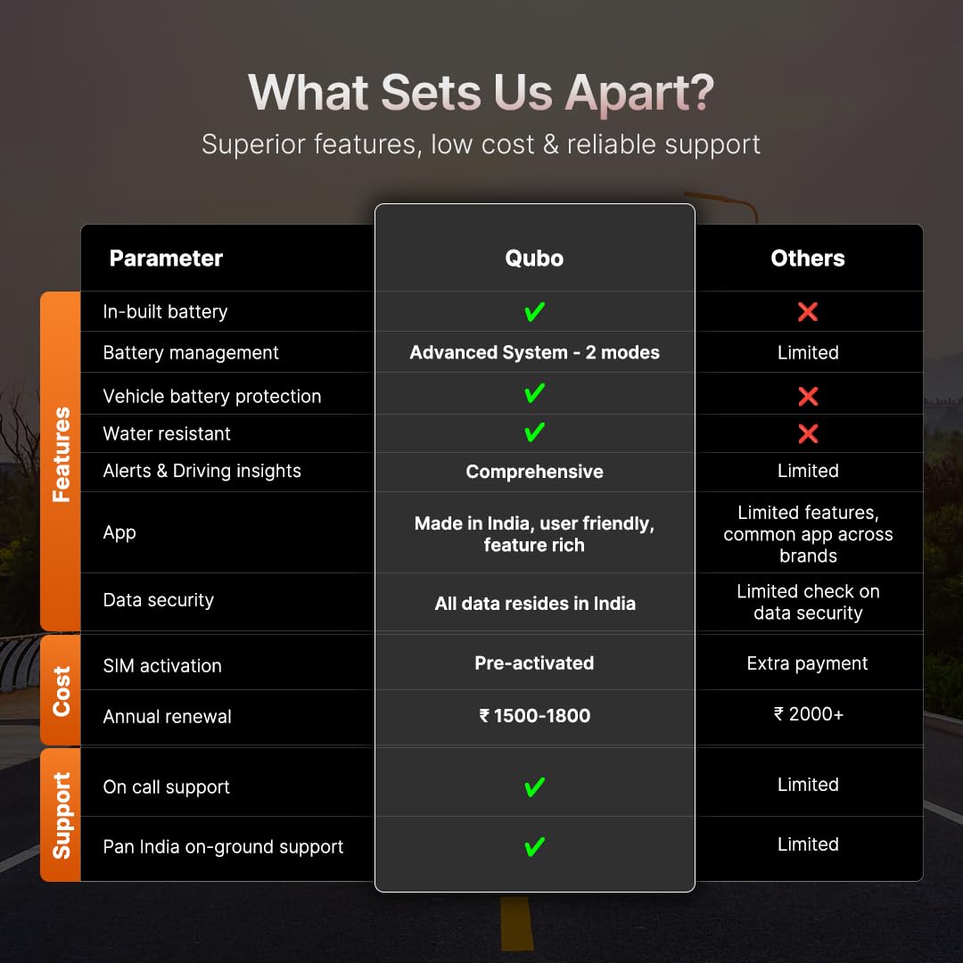 Built-in SIM with AI alerts on Qubo Go app—stay connected always.